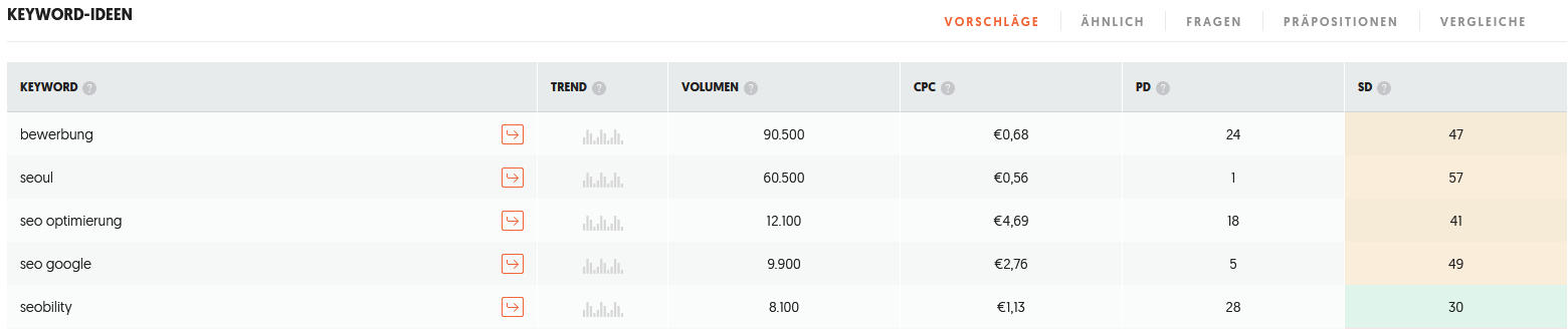 Ubersuggest: Ubersuggest ist ein benutzerfreundliches Tool von Neil Patel, das grundlegende Keyword-Informationen sowie Ideen für verwandte Keywords, Suchvolumen und Wettbewerbsdaten bietet.